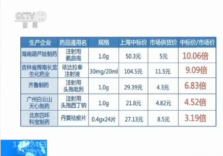 这名医药公司负责人还向记者提供了一些药品价格目录。记者注意到,这些用于心脑血管、抗感染等疾病治疗的常用药品,上海市药品中标价一般是市场批发价的5倍左右,最高的超过了10倍。