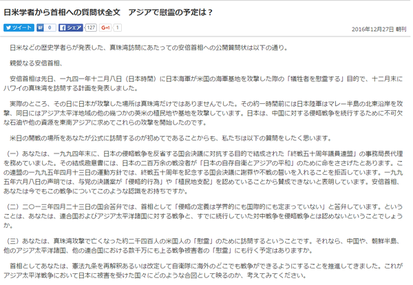 【环球网综合报道】针对日本首相安倍晋三对于美国珍珠港的访问,美日等国历史学者近日联合发表了一份致安倍的公开质问函,对安倍此次访问提出公开质疑。日本《东京新闻》12月27日报道公开了这份质问函全部内容。