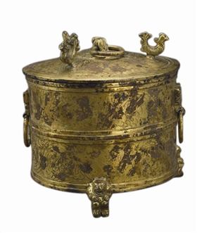 酒樽最早见于战国,盛行于汉晋。当时上流社会常置于席、案,饮宴时先将贮藏在瓮、壶中的酒倒在樽里,再用勺酌入耳杯,然后奉客??脊胖辛胶耗钩鐾恋牟驶嫣臻?、鎏金铜樽、玉酒樽、绿釉酒樽、漆木器酒樽均有发现,然厘定其器名不统一。因酒樽形似“奁”(lián),有圆形(直壁,有盖)、长方形、多边形,大多分层,流行于战国至唐、宋间,故而专家定名“奁”。1962年山西右玉大川村出土2件,器口与盖下子口沿阴刻铭文:“中陵胡傅铜温酒樽,重廿四斤,河平三年(公元前26年)造”。铜温酒樽为筒状、有盖、三兽足;另有1件为盆状鎏金兽足酒樽。从此其樽铭文定名得以确定,可知鎏金铜酒樽除盛酒外,还用作温酒。两汉时期帝王诸侯等贵族使用的珍奇铜器上常施以鎏金工艺,《史记·封禅书》:方士李少君对汉武帝曾说“祠灶则致物,致物则丹砂可化为黄金,黄金成,以为饮食器则益寿,益寿则海中蓬莱仙者可见,见之以封阐则不死?!焙捍持握呤褂闽探鹎嗤鞯哪康?,不仅是为了奢侈生活的需要,更是为了延年益寿、封阐成仙。
