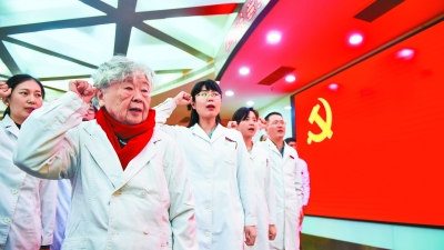 昨天中午,在北京友谊医院,95岁高龄的著名麻风病专家李桓英和其他新党员一起参加宣誓仪式,加入中国共产党。记者 邓伟摄