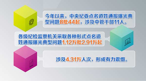 年初,中央纪委提出明确要求,对2016年1月1日以后发生的违反中央八项规定精神受到党纪政纪处分人员,原则上都要点名道姓通报曝光。今年以来,中央纪委点名道姓通报曝光典型问题8批44起,涉及中管干部11人。各级纪检监察机关采取各种形式点名道姓通报曝光典型问题1.12万批2.91万起,涉及4.31万人次,形成有力震慑。