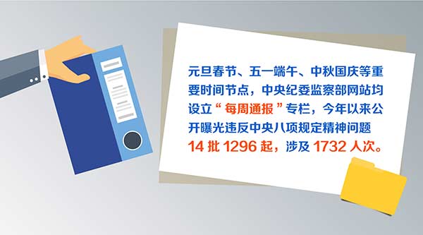 中央纪委坚持月报制度,每月定期公布《全国查处违反中央八项规定精神问题汇总表》。元旦春节、五一端午、中秋国庆等重要时间节点,中央纪委监察部网站均设立“每周通报”专栏,今年以来公开曝光违反中央八项规定精神问题14批1296起,涉及1732人次。