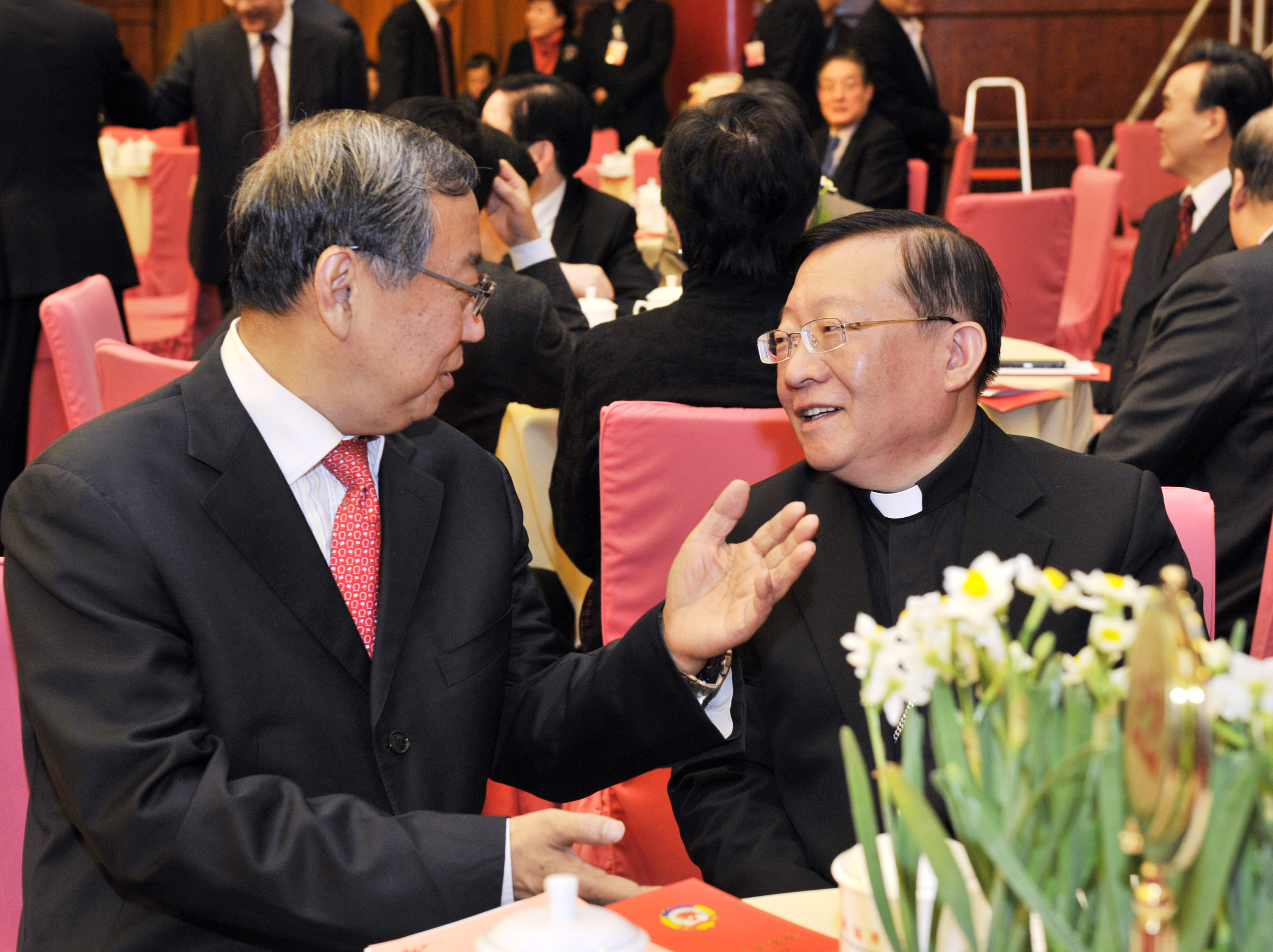 2016年12月30日,全国政协在北京举行新年茶话会。这是万季飞委员和马英林委员在一起亲切交谈。人民政协网记者 姜贵东 摄
