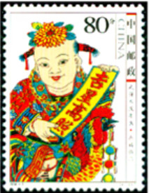 此外,2006年1月22日,中国邮政发行的《武强木版年画》特种邮票中,第二枚“五福临门”,其主体图案为头戴菊花、双手持“吉星高照”条幅的童子,这位童子的坐骑就是一只大公鸡。文/林墨