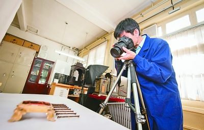 故宫钟表修复师王津为拆解完的零件拍照。新华社发