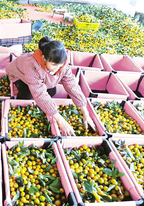 近日,广西壮族自治区融安县金橘全面上市。目前,融安县金橘种植总面积12万亩,产量达10.5万吨,产值近5.1亿元。图为融安县中国供销·桂北农产品电商园内,一名工人在分拣金橘。 新华社记者 陆波岸摄