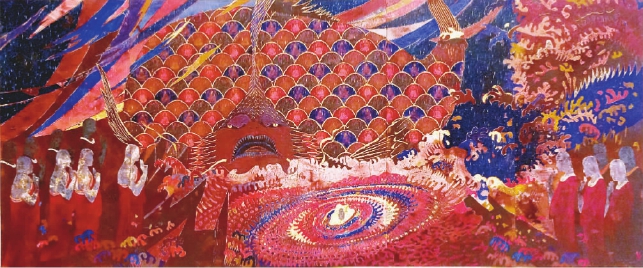 以“岩彩”材质作为形式建构的基础和形式转换的通道,能够自然而然的变异艺术创作的叙事方式:既可以延展中国的传统绘画和东方的审美意象;亦可以转换为“材质物语”的当代创作思维,作为当代艺术的中国方式,以及当代创作的独特视角。甘雨作品《从远方来到远方去》 、金鑫作品《无题》 、从各自对岩彩语言的理解出发,采用迥异的制作手段,创造出“岩彩”开放多样的未来空间。