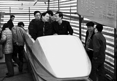 2001年2月10日,“高温超导磁悬浮试验车”在四川成都西南交通大学正式通过国家级验收,该课题责任专家赵忠贤(前右)兴奋地登上实验车。尹钢摄/光明图片/视觉中国