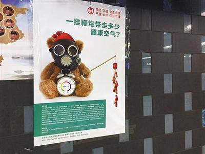 记者昨天在地铁站内发现一组市政府烟花办印发的宣传画,内容是宣传减少燃放烟花。其中两幅宣传画直接以PM2.5作为宣传主题——“PM2.5+鞭炮=?”还有一幅画面是一个戴着防化面具的玩偶手持鞭炮,其身边的闹钟则设计成PM2.5污染浓度显示仪。近几年,引导市民减少烟花燃放的官方宣传画出现在地铁里尚属第一次。