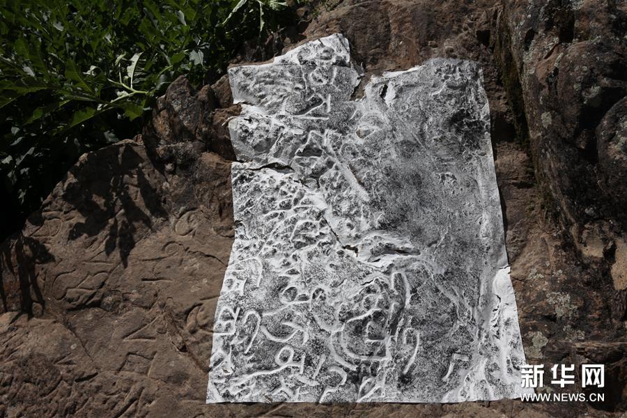 考古人员在西藏昌都市芒康县嘎托镇巴拉村石刻前进行考古工作(2016年7月18日摄)。新华社发(卢素文 摄)