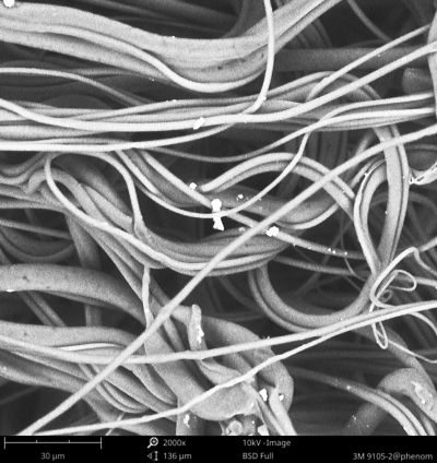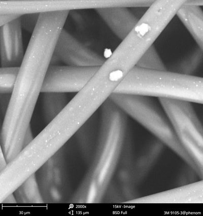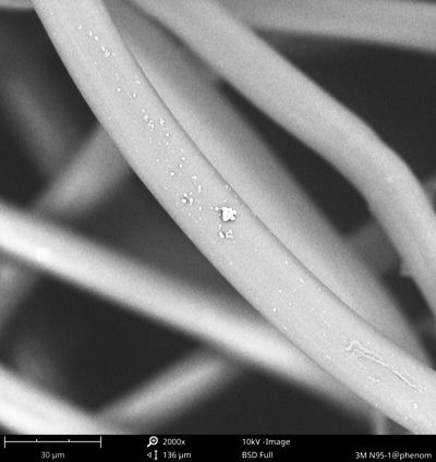 1月6日上午,记者佩戴了一款全新的N95防护口罩(型号3M8210),从南五环的亦庄地区出发,来到位于北三环的北京化工大学。实验人员对记者佩戴的口罩进行了破拆,随后选取口罩同一位置的里外三层,剪成指甲盖大小的方块,用特殊的胶带黏结在电镜的观测探头上,然后将探头放入机箱内进行观测。放大2000倍后,记者看到,口罩第一层的纤维直径约为17.2微米,黏附在上面的雾霾颗粒的直径约为1.2微米。成分分析显示颗粒含有钙、硅、碳等元素。刘勇介绍,钙可能来自于沙土,硅可能来自于扬尘。第二层口罩纤维更为致密,孔隙更小。经过测量,第二层纤维的直径约为1微米。记者看到,纤维上仍然有一些“漏网之鱼”,它们的个头更小,很多都已经达到了纳米级别。第三层,口罩纤维的直径又变粗了,到达这一层的雾霾颗粒则更少。