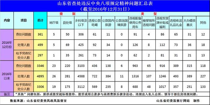 2016年全年山东省各级纪检监察机关共查处违反中央八项规定精神问题3346起,处理4895人,处分3306人。