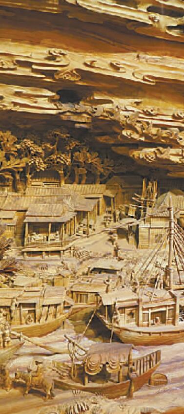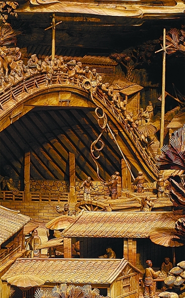 《清明上河图》可谓是莆田木雕技法的集大成者。整个作品融会了镂空雕、透雕、浮雕和精微透雕等雕刻技法,繁而不杂,层次分明,街市的喧闹声、行船声和流水声都仿佛在耳畔。