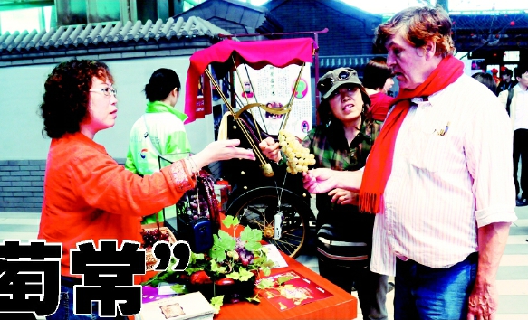 “葡萄常”传人常弘向外国人介绍工艺作品。