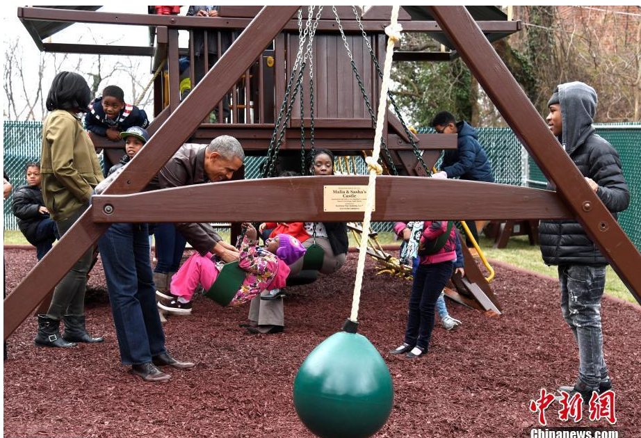 当地时间2017年1月16日,美国华盛顿,美国总统奥巴马和第一夫人米歇尔参加庇护所的服务活动,帮助绘画马丁路德金的壁画,在自己捐赠的游乐设施陪孩子一起玩秋千,庆祝马丁·路德·金纪念日。