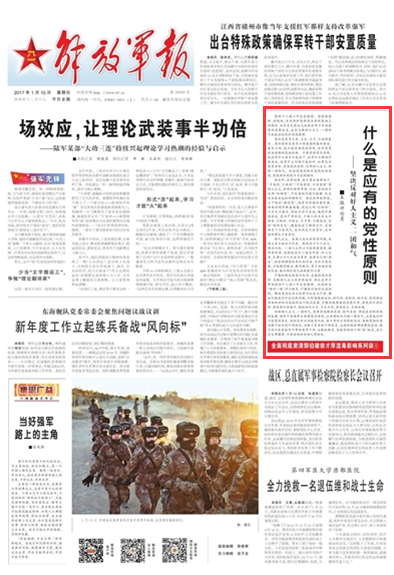 党性是党员立身、立业、立言、立德的基石,党性原则是党员必须遵循的基本要求、基本立场。党的十八届六中全会强调,坚持讲原则、讲规矩,共同维护坚持党性原则基础上的团结。今天出版的《解放军报》刊发评论员文章《什么是应有的党性原则》,强调严格和规范的党内生活,是锤炼党性原则、克服好人主义的重要途径。