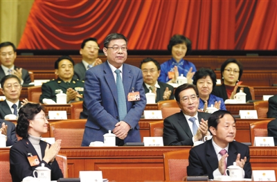 昨日表决通过后,现场报以持续约两分钟的掌声,坐在主席台第二排的杜德印先后两次起立,面向代表鞠躬两次,面向身后的主席团鞠躬一次,最后在掌声中落座。