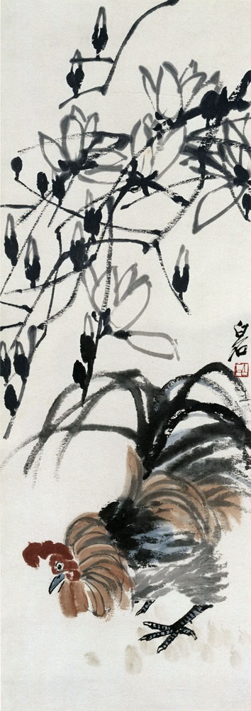 齐白石《玉兰公鸡》