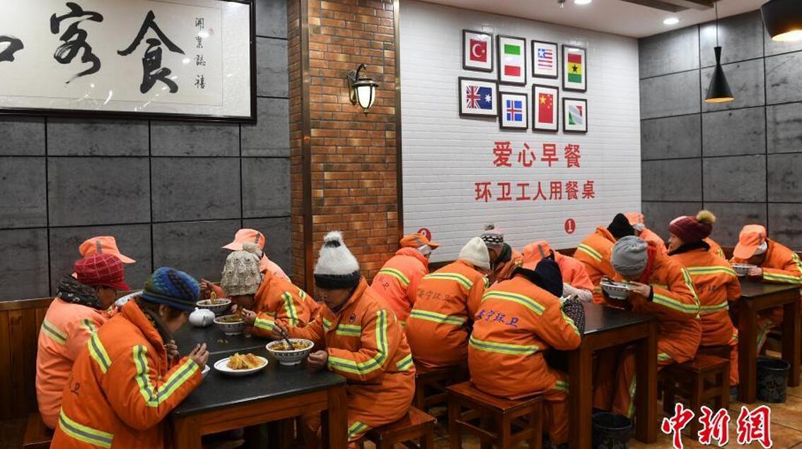 1月19日,兰州市一家牛肉面馆内环卫工人正在享用牛肉面免费早餐。自1月中旬起,兰州市官方启动“爱心早餐”工程,由兰州市城管委与兰州市牛肉面协会协商,动员牛肉面经营企业、经营户参与关爱环卫工人的行动,采取政府出资、企业让利的方式,为一线环卫工人提供“爱心早餐”。据兰州市城管委介绍,兰州市现有9014名环卫工人,为他们提供的“爱心早餐”将纳入政府每年的财政预算,作为一项民生工程持续开展下去。中新社记者 杨艳敏 摄