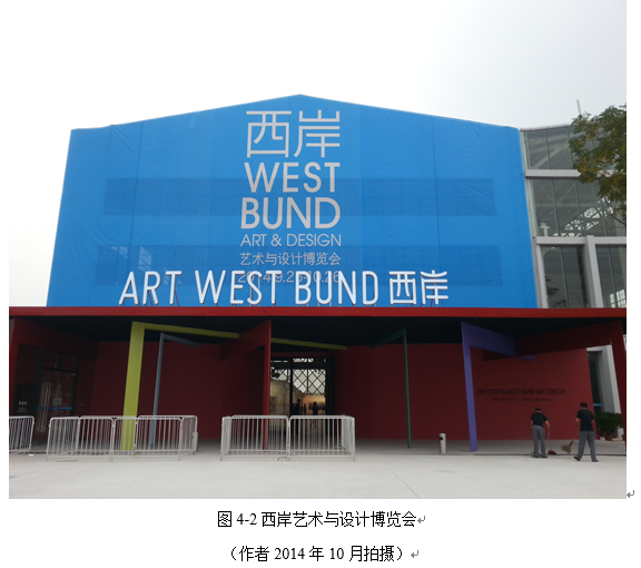 原上海飞机制造厂的冲压车间改造成的西岸艺术中心在2014年9月推出了第一届西岸艺术与设计博览会,首届西岸艺术与设计博览会是徐汇滨江文化艺术区继龙美术馆、余德耀美术馆、保税仓库之后的一个大动作,博览会使这个区域的艺术链条更加完整(图4-1)。此次博览会提出“5+25”全新模式,也就是分为5天针对专业人士的博览会和25天面向公众的特展,主办方希望分别兼顾藏家购买作品与艺术爱好者欣赏展览的不同需求,最大限度地发挥艺术博览会的功能,试图让整个博览会“慢”下来。小而精是西岸艺博会整体的特色,虽然只有25家,参展的画廊几乎都有响当当的名声或者不俗的实力,画廊的质量远比数量值得称道,上海的艺博会开始了精致路线的服务。此次西岸的保税仓库为国外画廊提供了相当优惠的政策,来自瑞士圣加仑的约瑟夫松锅炉房画廊创始人菲利克斯·雷纳(Felix Lehner)表明,如果他们带来的雕塑大师汉斯·约瑟夫松的作品只停留在博览会中,就不需要交税。[4]