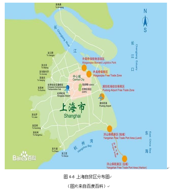 中国(上海)自由贸易试验区(以下简称“上海自贸区”)于2013年8月由国务院批准设立,2013年9月29日正式挂牌运行。在浦东新区外高桥保税区、外高桥保税物流园区、浦东机场综合保税区和洋山深水港区等四个海关特殊监管区域推进制度改革,面积28.78平方公里(图4-6)。作为我国第一个自贸试验区,是中国在探索开放道路上的里程碑。该区域以推进外资享受国民待遇,实施负面清单管理模式,实现人民币资本项目可自由兑换,率先建立符合国际化和法治化要求的跨境投资和贸易规则体系,并对文化服务领域进一步放开。