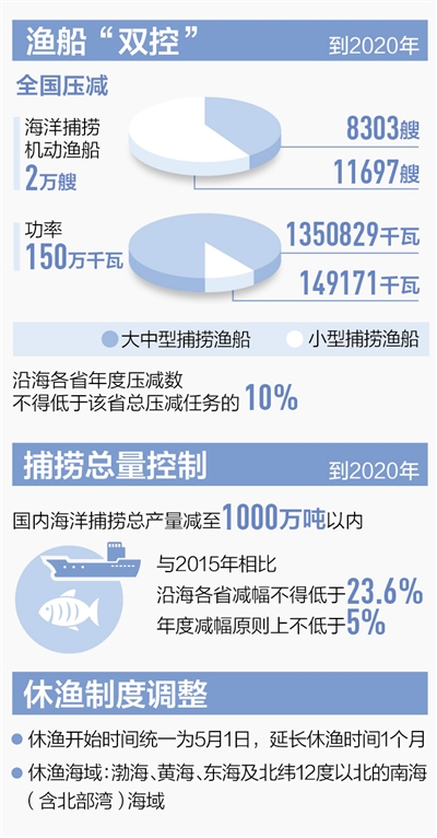 按照通知要求,到2020年全国压减海洋捕捞机动渔船2万艘、功率150万千瓦。除淘汰旧船再建造和更新改造外,不新造和进口在我国管辖水域生产的渔船。