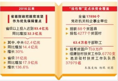 资金投入力度加大,资金使用效益提升。2016年以来,省级财政把脱贫攻坚作为优先保障重点,省级以上投入达到93.4亿元,同比增加32.3亿元。其中,中央62.4亿元,同比增加14.4亿元、增长30%;省级31亿元、同比增加17.9亿元、增长136.6%。各级扶贫投入力度与打赢脱贫攻坚战的要求越来越匹配,投入力度逐年加大。