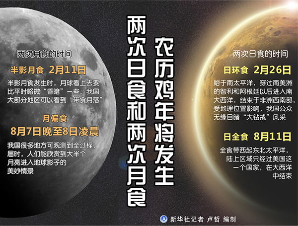 新华社天津2月2日电(记者周润健)天文预报显示,农历丁酉鸡年将发生两次日食和两次月食。