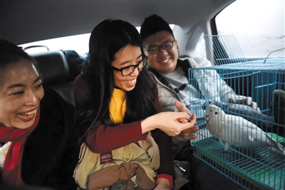 今年回家,侯可宝选择了跨城顺风车。他联系上了准备驾车回家过年的马洪明和另外两个山东女孩刘霞和宫熙艳。就这样,4个人,3只鹦鹉,从北京到青岛,开始了他们800多公里的顺风旅程。