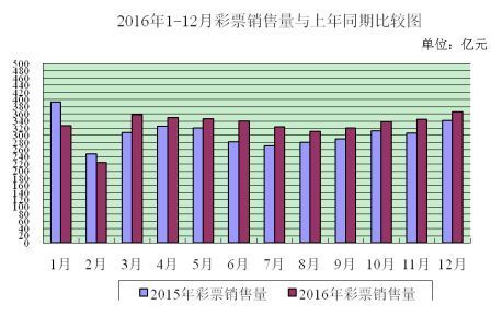 12月份,全国共销售彩票365.94亿元,比2015年同期(简称“同比”)增加24.73亿元,增长7.2%。其中,福利彩票机构销售199.84亿元,同比增加7.71亿元,增长4%;体育彩票机构销售166.1亿元,同比增加17.02亿元,增长11.4%。