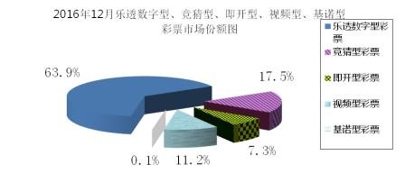 12月份,乐透数字型彩票销售233.9亿元,同比增加14.08亿元,增长6.4%;竞猜型彩票销售64.02亿元,同比增加9.52亿元,增长17.5%;即开型彩票销售26.72亿元,同比减少1.39亿元,下降4.9%;视频型彩票销售41.13亿元,同比增加2.6亿元,增长6.7%;基诺型彩票销售0.17亿元,同比减少0.08亿元,下降32.1%。12月份,乐透数字型、竞猜型、即开型、视频型、基诺型彩票销售量分别占彩票销售总量的63.9%、17.5%、7.3%、11.2%和0.1%。