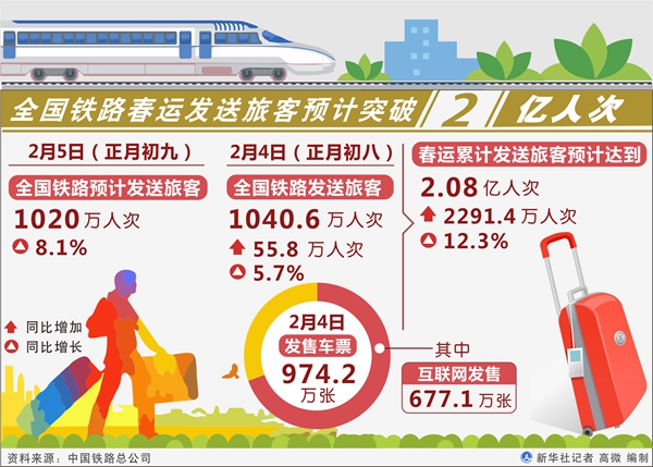 新华社北京2月5日电(记者樊曦)记者从中国铁路总公司获悉,5日(正月初九),全国铁路预计发送旅客1020万人次,同比增长8.1%。春运累计发送旅客预计达到2.08亿人次,同比增加2291.4万人次,增长12.3%。