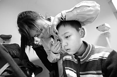 昨天,在首都儿研所视觉电生理检查室,医师正在为一名患儿进行角膜塑形术治疗。记者方非摄