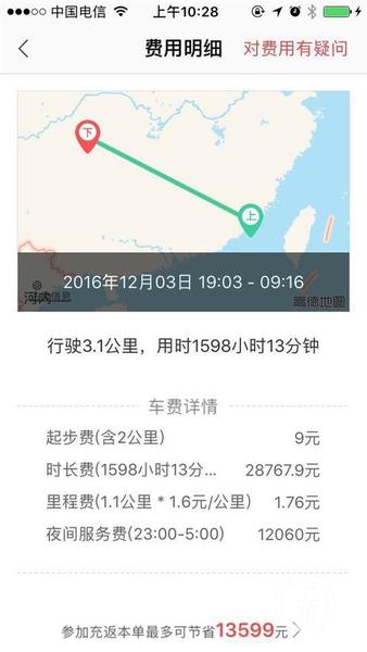 如今,不少市民出行,都会使用各种各样的打车软件,叫一辆网约车去往目的地。不过对于家住渝北新牌坊的市民赵先生来说,一次两个多月前的叫车经历,却让他在2月8日这天遭遇了一张天价行程单——短短3.1公里的行程,却被要价40838.66元。这到底是怎么回事呢?