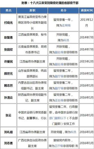 据统计,算上最近被降级的民政部原党组书记、部长李立国和天津原副市长尹海林,截至目前,十八大以来至少有20名省部级干部因严重违纪受到降级处理(详细名单见文后表格)。这些被降级的省部级干部涉及党政、政协、国企等多领域。其中,赵智勇、刘礼祖和赖德荣被给予的处分最重,从副省级连降七级至科员,已退休的张力夫被按照副科级确定退休待遇。张田欣、许爱民、孙清云、张云、朱福寿、曹建方、范坚、尹海林被降为处级非领导职务,其余人员均被降为厅局级。
