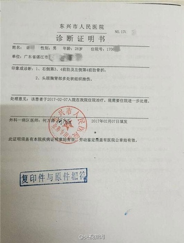《京华时报》2月11日消息,2月7日,3名中国公民经越南芒街口岸回国时,被越南边检人员索要小费,其中一名男子被越南边防人员殴打致3根肋骨骨折,另有至少1根肋骨不完全骨折,多处软组织挫伤。