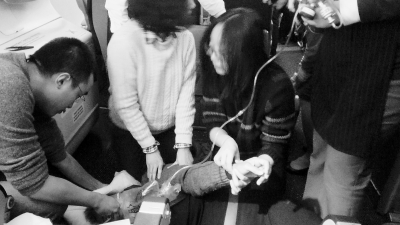 两名懂得医术的年轻女乘客跪在地上,一个为发病女乘客把脉,另一个为她戴上氧气面罩。号脉,翻看眼睑……最后,她们诊断女乘客是低血压引起的全身颤抖,需要输液。随后,空乘人员拿来两个输液药袋,她们给发病女乘客进行了静脉注射。王珂则充当了临时的“人肉输液架”,手里举着两包输液药袋站在一旁。后来,他借了一个衣架,才把输液袋挂在旁边的行李架上。经过一个多小时的抢救,发病女乘客终于慢慢苏醒。