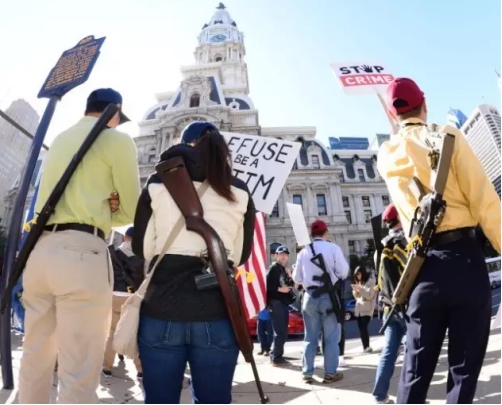 几乎在同一时间,来自美东地区的约两千名华人在费城举行了一场名为“反暴力,要安全”的维权大游行。游行队伍中还有一支大约由150人组成的公开携枪游行队伍,携枪队员均挂出拥枪许可,并在枪上插有黄色“空膛旗”,每人手举反对暴力犯罪的标语牌。