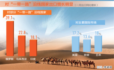 从主要国际市场看,我国对美国、欧盟、日本等传统市场出口分别增长17.2%、13.6%、18%;对部分“一带一路”沿线国家出口增长明显,其中对俄罗斯、马来西亚、印度等国家出口分别增长39.1%、22.8%和18.1%。