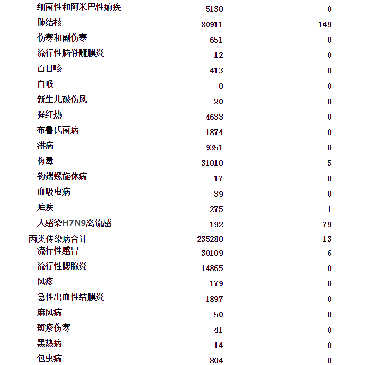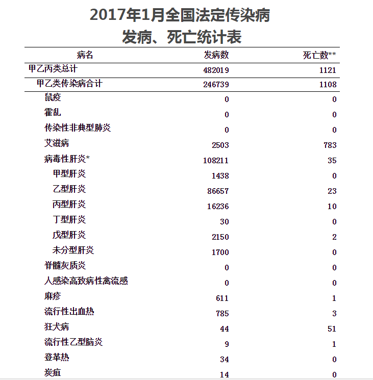 《概况》指出,2017年1月(2017年1月1日0时至1月31日24时),全国(不含港澳台,下同)共报告法定传染病482019例,死亡1121人。其中,甲类传染病鼠疫、霍乱无发病、死亡报告。乙类传染病中传染性非典型肺炎、白喉、脊髓灰质炎和人感染高致病性禽流感无发病、死亡报告,其余22种传染病共报告发病246739例,死亡1108人。报告发病数居前5位的病种依次为病毒性肝炎、肺结核、梅毒、淋病以及细菌性和阿米巴性痢疾,占乙类传染病报告病例总数的95%。