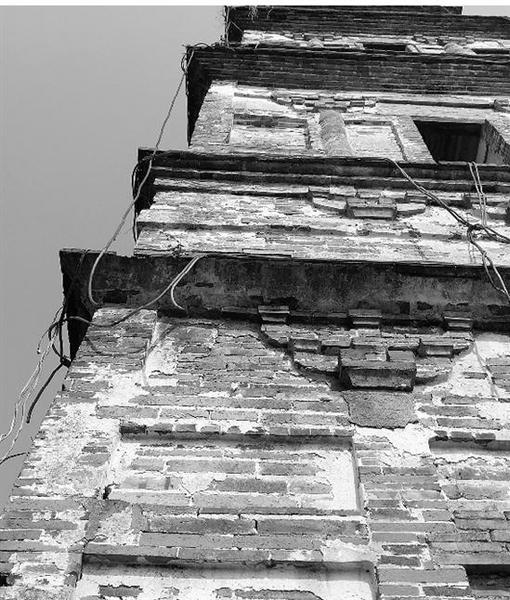 但千年古塔也面临着种种尴尬:塔边围栏破损严重,塔身多处砖构件缺少、悬垂着报废的串灯,各种大面积的涂鸦很刺眼……