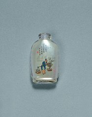 烟壶虽小,但方寸之间,别有天地。内画壶制作工艺考究,一件完美的内画壶需经选料、制坯(壶)、壶内书画、装潢四项工艺流程。其工时少则几周,多则数月,因此价值不菲。内画鼻烟壶的材料多为水晶、玻璃或玛瑙、琥珀等材料。