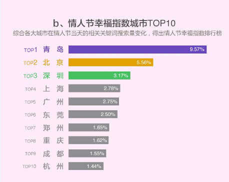 奇虎360大数据中心发布的《情人节城市寂寞指数排行榜》中,情人节幸福指数城市TOP10。