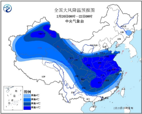 中央气象台2月20日6时继续发布寒潮蓝色预警:受强冷空气影响,20日8时至22日8时,新疆、西北地区东部、西南地区东部、华北中南部、黄淮、江淮、江汉、江南、华南北部等地气温将下降8℃以上,部分地区超过12℃。
