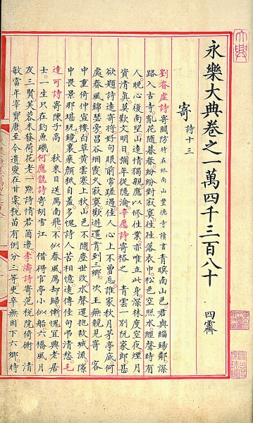 2007年11月,一册《永乐大典》的出现让赴上海调查古籍善本的全国古籍普查专家组既惊喜又疑惑。眼前这册大典品相良好,明代包背旧装,字迹端工的馆阁体,从封面至纸页皆无缺损,内容为有关“湖”字的唐宋元诗文,正好弥补了国图藏《永乐大典》湖字韵的缺卷。
