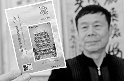 姜普林展示收藏的尼加拉瓜发行的有黄鹤楼图案的纪念邮票 记者熊波 摄姜普林展示收藏的尼加拉瓜发行的有黄鹤楼图案的纪念邮票 记者熊波 摄