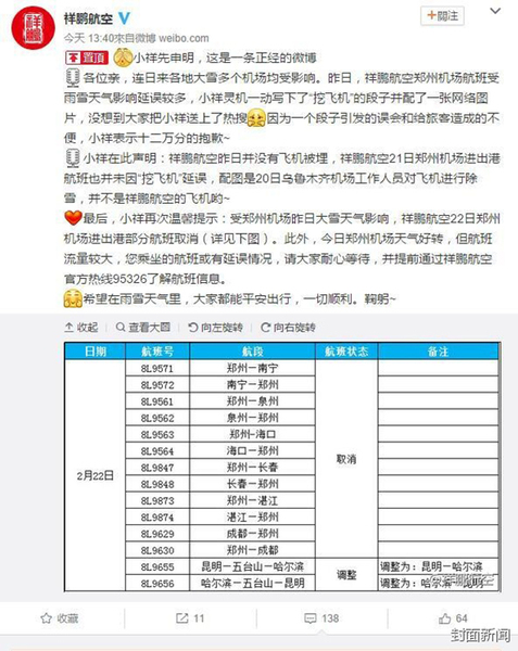 记者致电云南祥鹏航空有限责任公司有关部门,工作人员回应称,祥鹏航空郑州机场航班受雨雪天气影响延误较多,微博编辑写下了“挖飞机”的段子并配了一张网络图片。