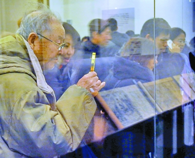 由国家图书馆、国家古籍?;ぶ行?、辽宁省文化厅共同举办的“辽宁省珍贵古籍特展”上,参观者在研读《赵城金藏》。潘恩战摄光明图片/视觉中国(图片除署名外,均由国家图书馆提供)