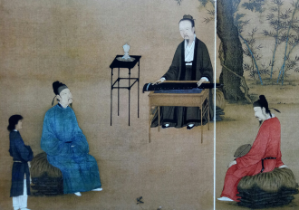 其汉人头裹重阳巾、着深衣,旁近两仕女头上包髻巾、上襦下裙。