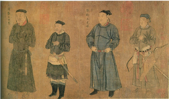 赵佶交领内着交领衫,无中单,下穿裳,外披鹤氅及地,脚着玄履,侍臣幞头隆起展脚,革带下插,团领长袍内衬中单。